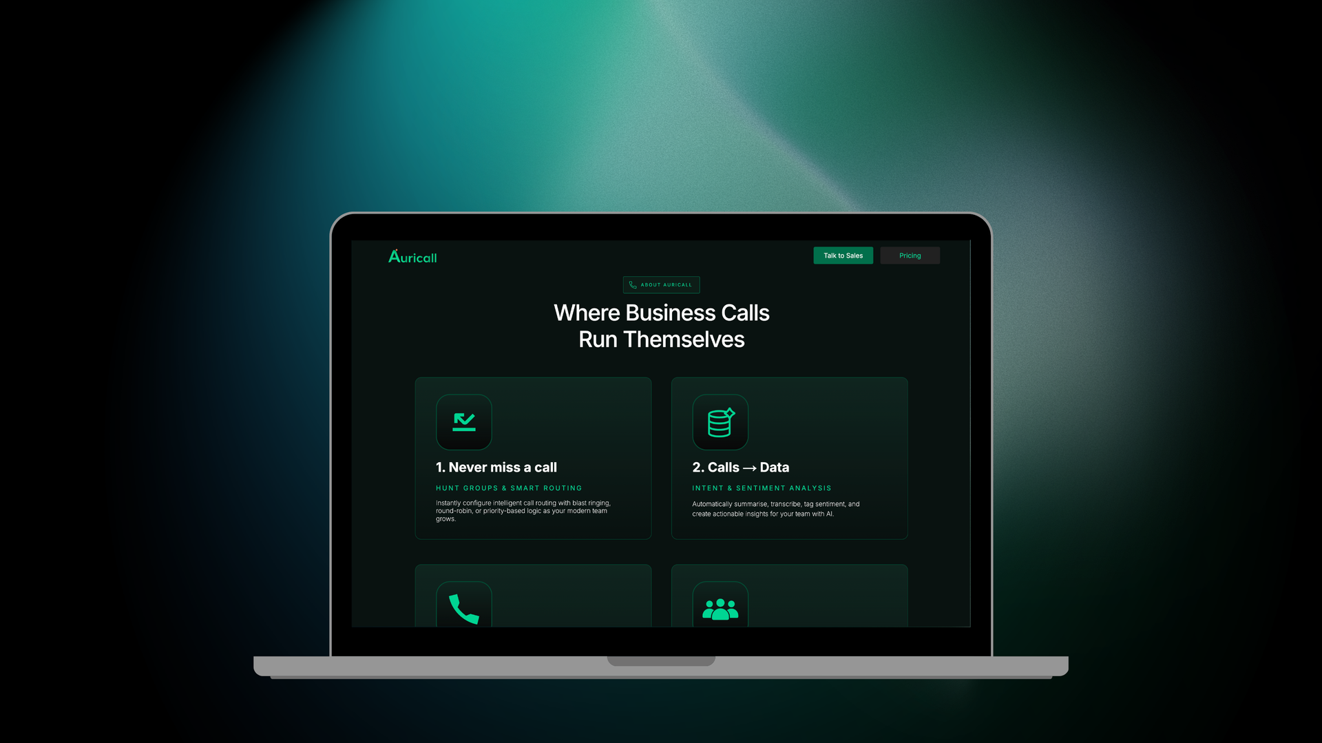 Website design for Auricall, an AI-powered business phone and voice communications platform that helps teams handle calls, transcriptions, analytics and insights with smart routing and automation.
